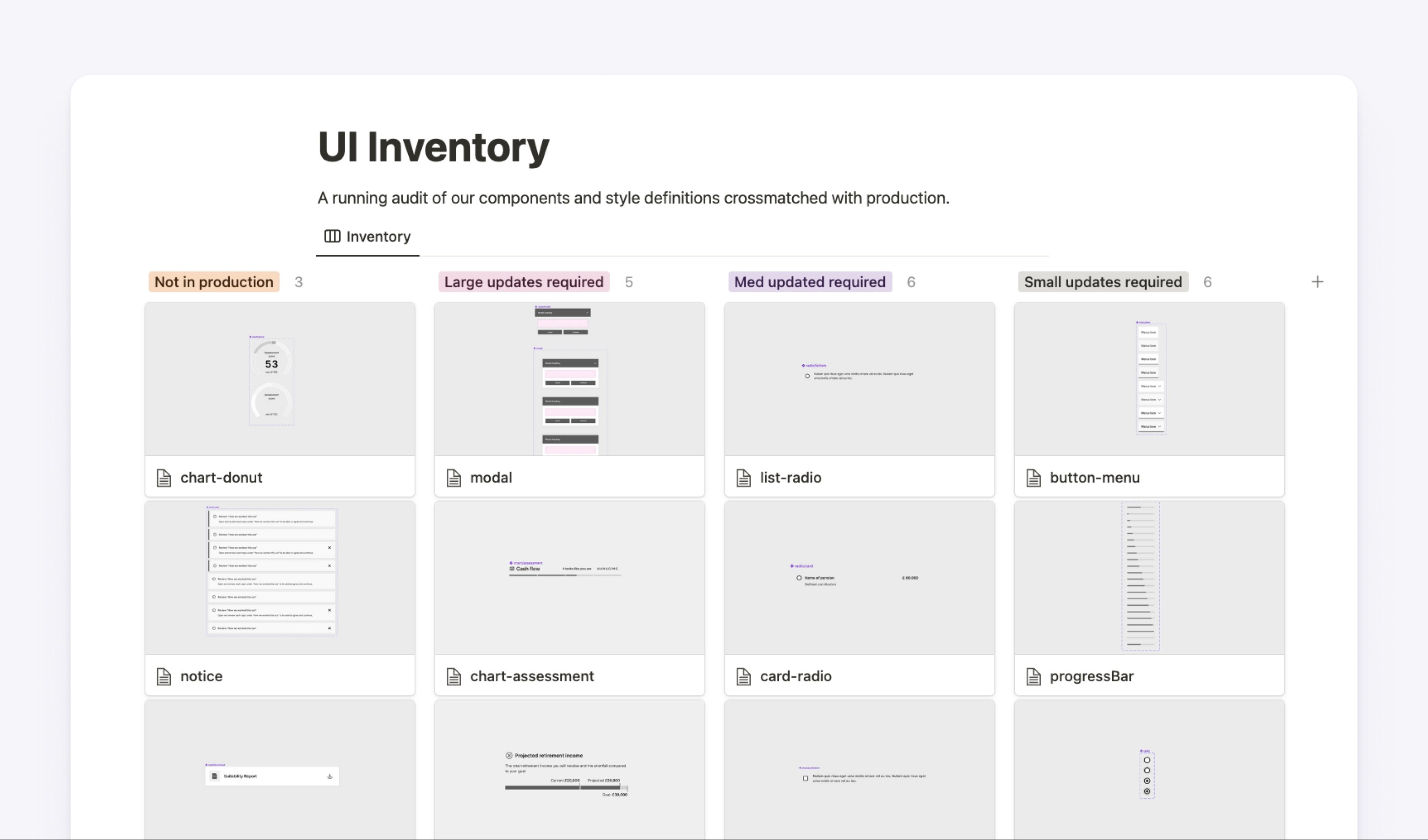 Creating an inventory of components across Sketch and Figma and understanding how they aligned with production was an important first step. I screen-grabbed everything I found, cross-referenced design files with frontend components and organised them by the effort required to get everything in sync.