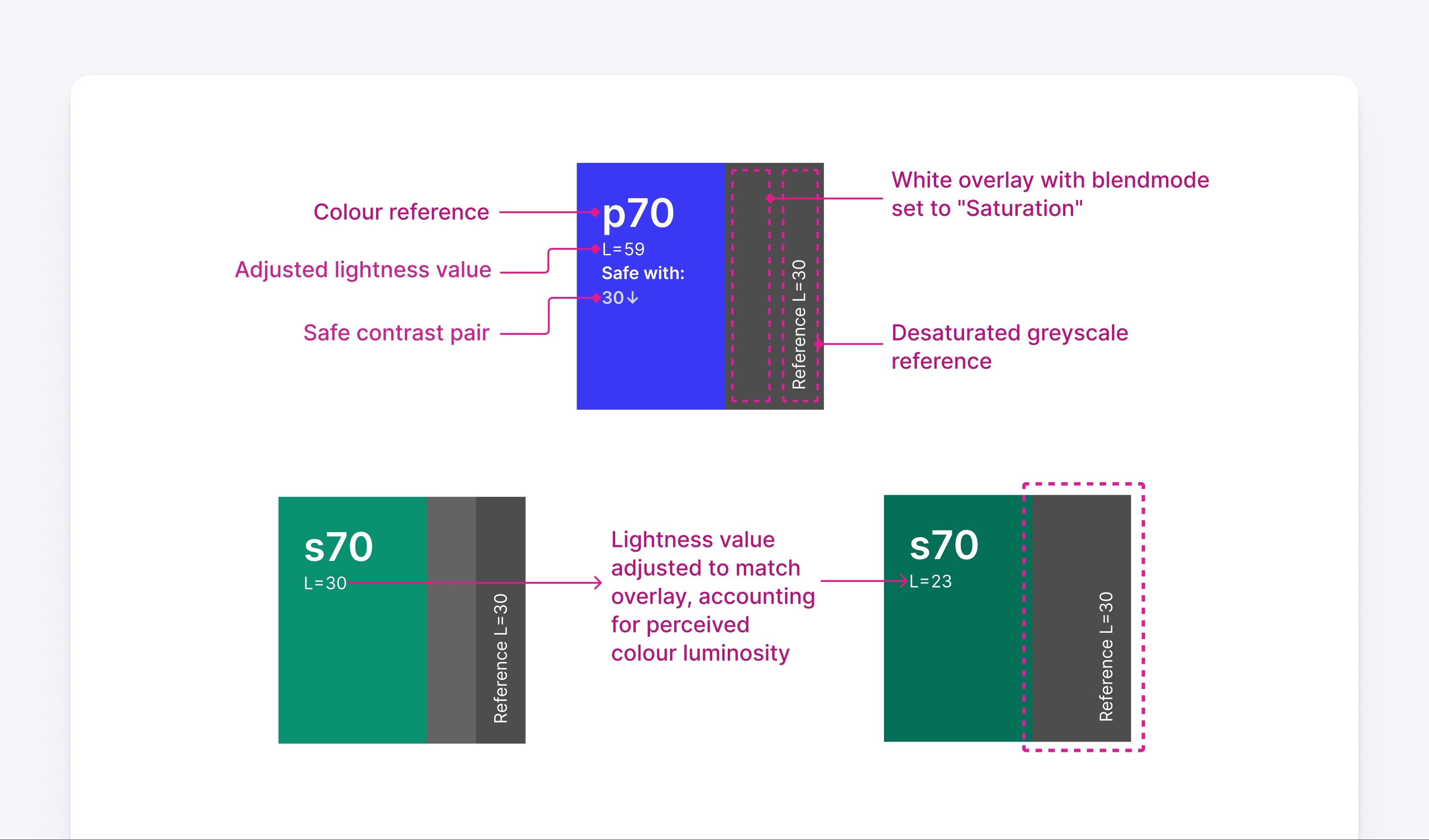Hue values were locked to the brand colour. Saturation and Lightness values were adjusted so that desaturated versions of the colour matched a reference grey value.