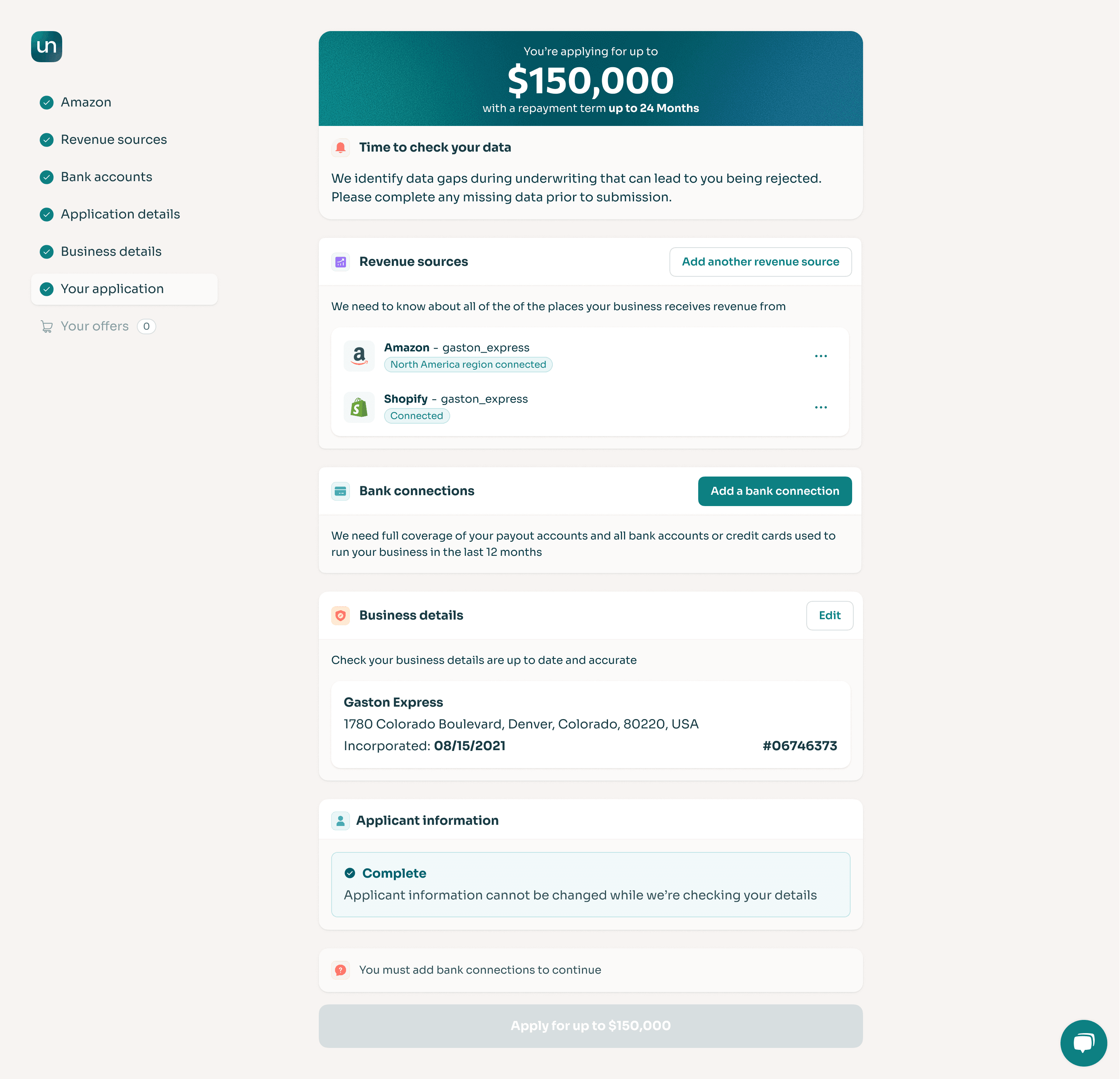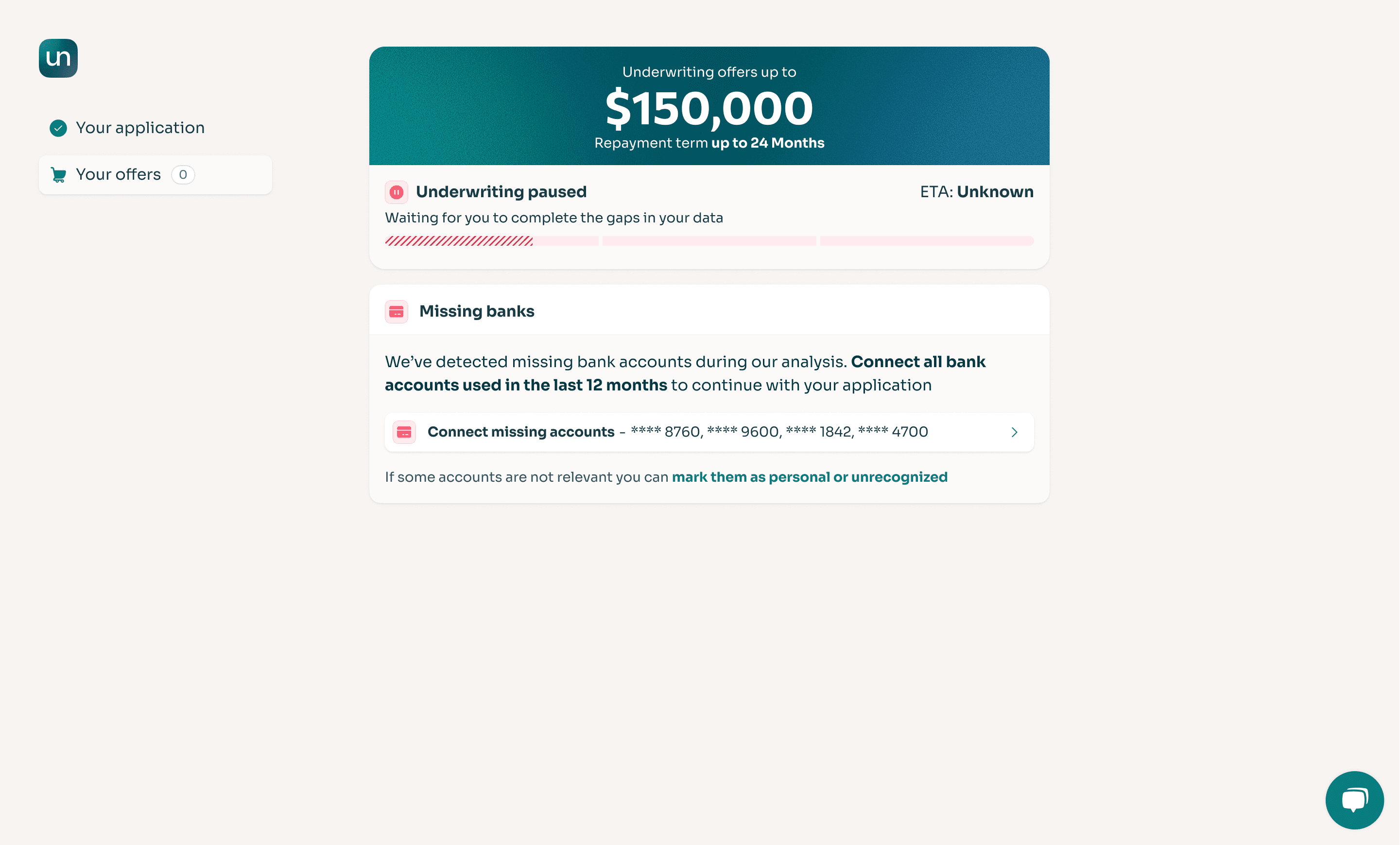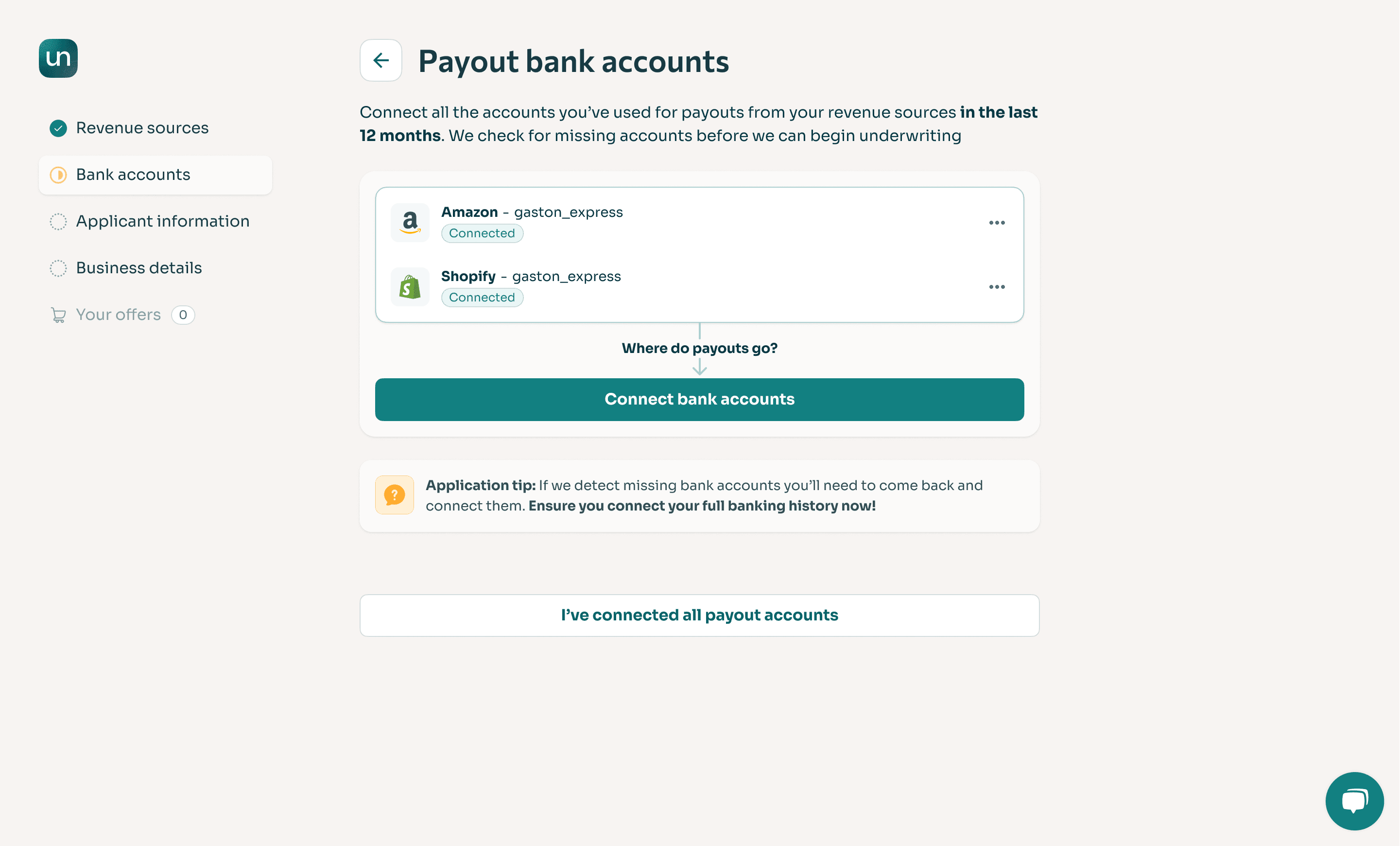 The engineering team worked hard to develop detection methods which matched transactions from sales connections with bank accounts we didn't have connected yet. I completely overhauled the Pre-Offer experience to provide a method for customers to connect missing accounts without going through time-consuming communications with underwriters.
